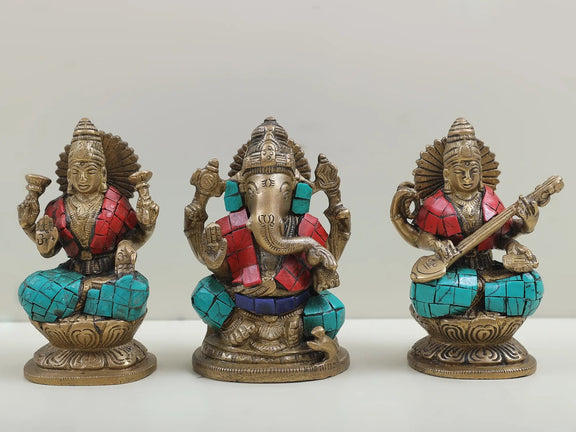 This stunning trio idol, featuring the Hindu deities Saraswati, Ganesha, and Lakshmi, is handcrafted with inlaid brass for a beautiful design. Perfect for adding a touch of cultural and spiritual elegance to any space. A perfect gift for any occasion.