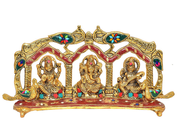 Metal Laxmi Ganesh Saraswati Idol with peacock frame (Height: 6 Inch)