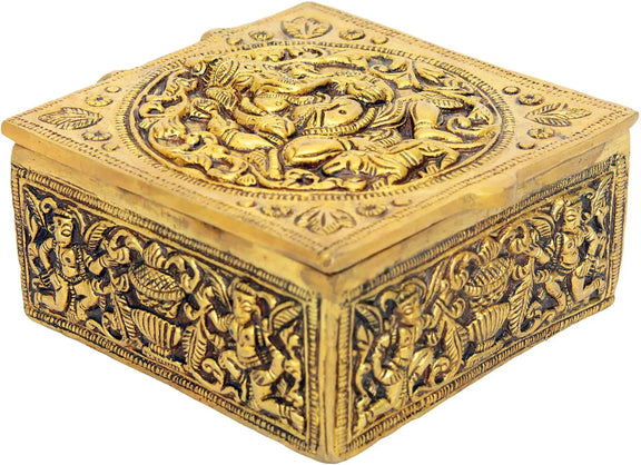 Display your devotion with this beautiful 4-inch box featuring the revered Lord Ganesha, intricately crafted with natural brass. Perfect for storing small treasures or simply as a decorative piece, this box will bring blessings and positive energy into your home. Invoke divine protection and prosperity with every use.