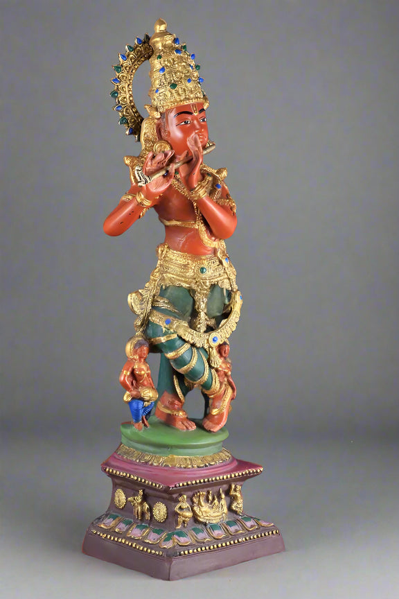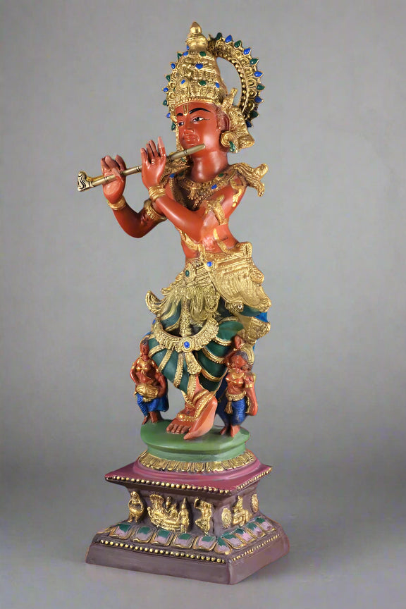 This exquisite 30-inch Lord Krishna Murti is meticulously hand-painted on pure brass, blending traditional artistry with timeless elegance. Its detailed craftsmanship captures the divine essence, making it a refined centerpiece for any sacred space or sophisticated décor. Ideal for those who appreciate spiritual beauty and artisanal quality.