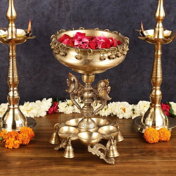 Pure Brass Urli with Stand Diyas (Height:13 Inches)