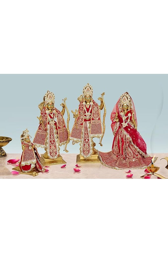 Add a touch of elegance to your temple with our Brass Ram Darbar Murti, complete with a stunning red dress. At 20 inches tall, this murti exudes grace and divinity. Bring blessings and beauty to your worship space with this magnificent addition.