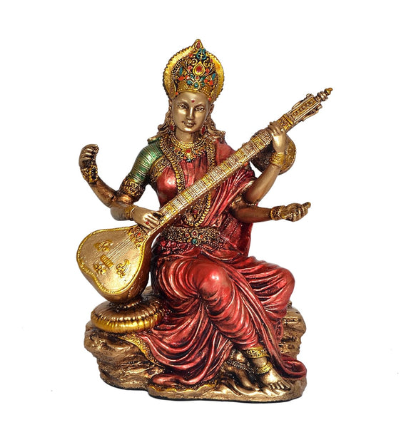 Saraswati Idol - Sculpture Hindu Goddess of Knowledge, Music (Resin, Multicolour) Height 6" inches
