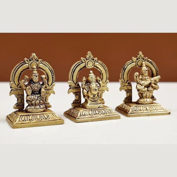 Brass Set of three small statues of Ganesha, Lakshmi, and Saraswati (Height: 2 inches)