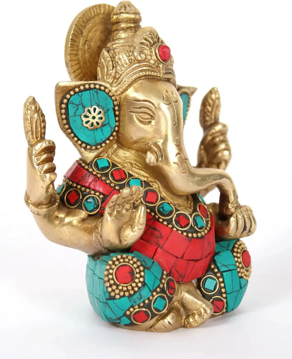 Small brass idol of Lord Ganapati with inlay work 4 inches