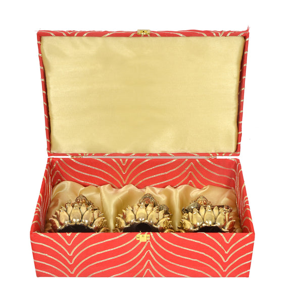 This auspicious gift, which comes in a gorgeous, regal, luxury gift box, is ideal for corporate gifting or Diwali Puja. Bring the combined blessings of Lord Ganesh (Success), Goddess Saraswati (Knowledge), and Goddess Lakshmi (Wealth) into your house or place of business. A classic, tasteful, and profoundly significant gift.