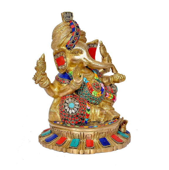 Bring Ganpati home with this stylish Mangalkari Ganesh in Pagdi On Asan Golden Brass Statue Idol Murti (Height : 9.5 Inches)! With its intricate stone work and golden brass finish, this statue is sure to add a touch of divine beauty to your home. Ideal for Ganesh Chaturthi festivities and beyond!