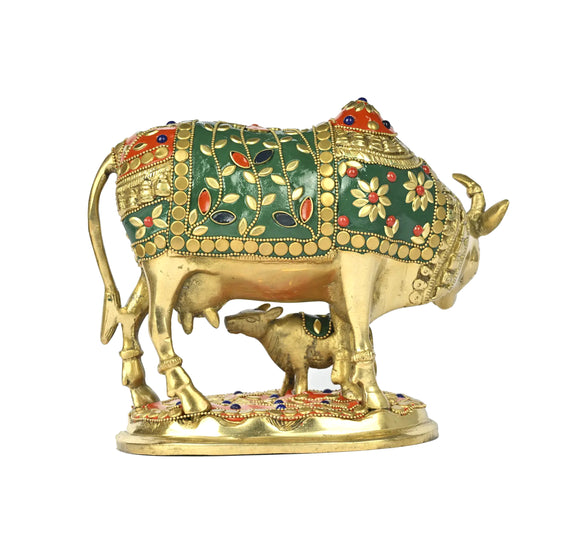 Brass Cow and Calf with Inlay Work Sculpture (Height :8 Inches)
