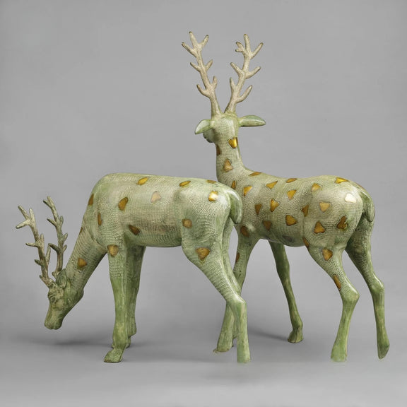 Elevate your décor with this stunning brass deer sculpture, a masterpiece that captures timeless elegance and natural beauty. Standing at an impressive 27 inches, this striking piece features an exquisite leaf green patina finish that adds depth and character to any space. Handcrafted with meticulous attention to detail, the sculpture showcases the graceful posture of a standing deer, making it a captivating focal point for living rooms, gardens, or galleries. The weathered patina not only enhances its artistic appeal but also speaks to its quality craftsmanship and durability. Perfect for collectors and design enthusiasts, this brass sculpture transforms your environment into a sanctuary of refined taste and sophisticated style.