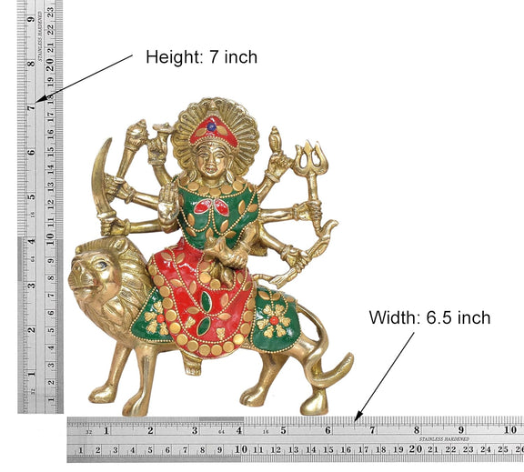 Brass Durga Maa with Lion Idol Hindu Goddess Sherawali MATA Murti MATA Rani Statue Figurine Home Temple (Height: 7 Inch)