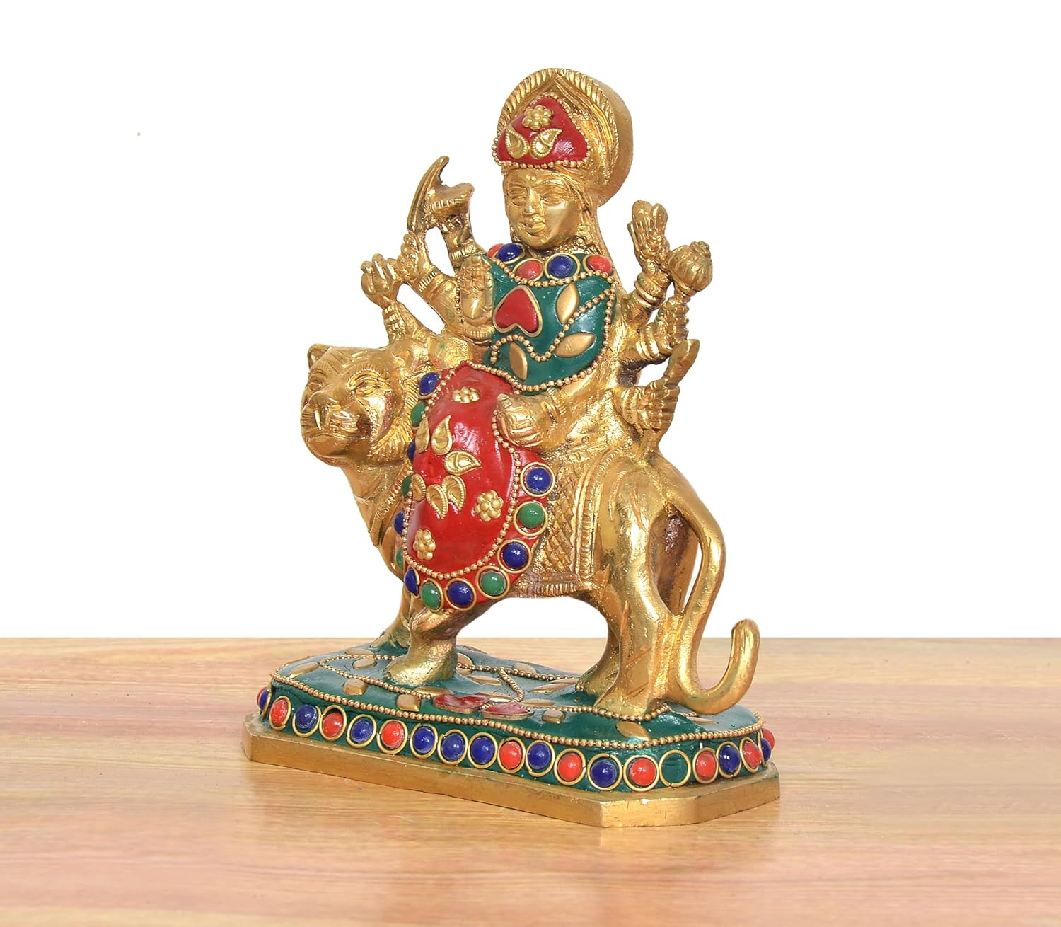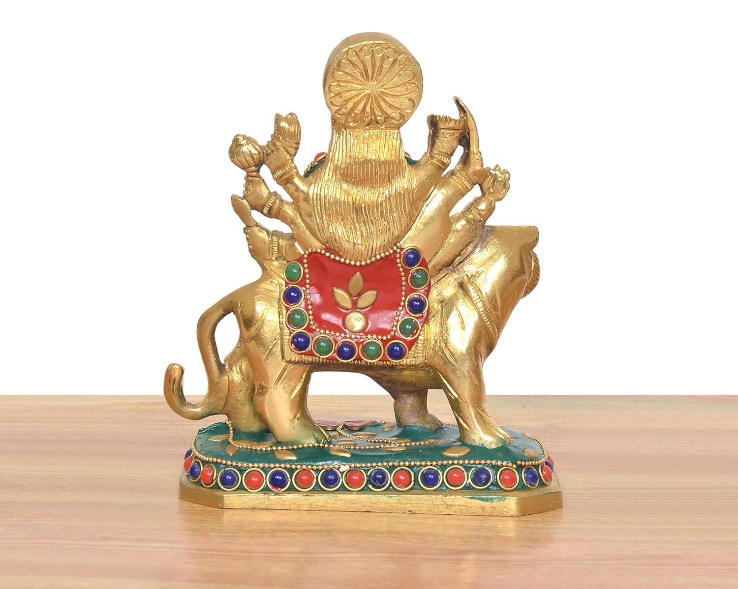 Brass Durga Maa with Lion Statue (Height: 6 Inch) (Multicolor 1)