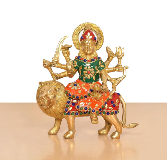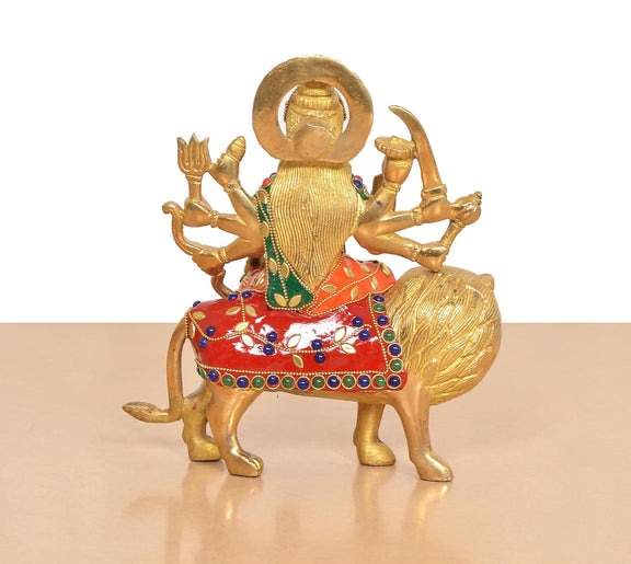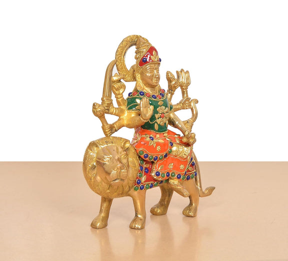 Brass Durga Maa with Lion Idol (Height: 8 inch)