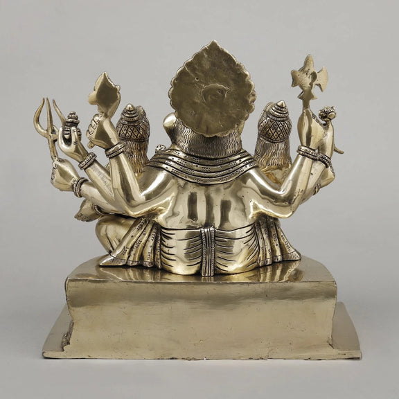 This meticulously crafted 13-inch brass Ganesh idol depicts Lord Ganesha seated majestically on a lotus, flanked by Riddhi and Siddhi—the goddesses of prosperity and spiritual attainment. The detailed workmanship showcases traditional iconography with precise attention to sacred proportions and symbolic elements. Crafted from premium brass, this devotional piece offers both religious significance and artistic excellence, making it an auspicious addition to home temples or meditation spaces.