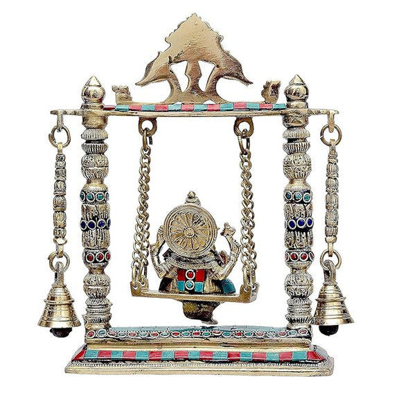 Introduce sophistication and elegance to your home with our Brass Ganesha on a Swing statue. Crafted with intricate details and a golden finish, it exudes luxury and exclusivity. The accompanied bells add a touch of charm while the size (10.2x8.6x3.0 inches) makes it the perfect statement piece for any room.