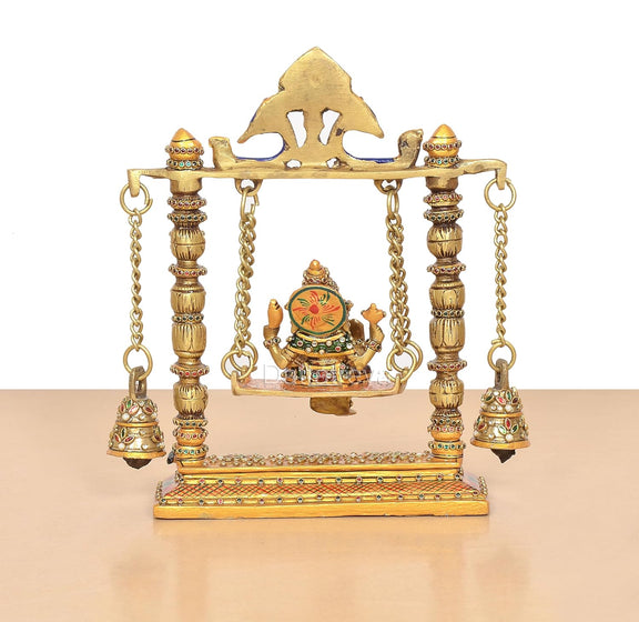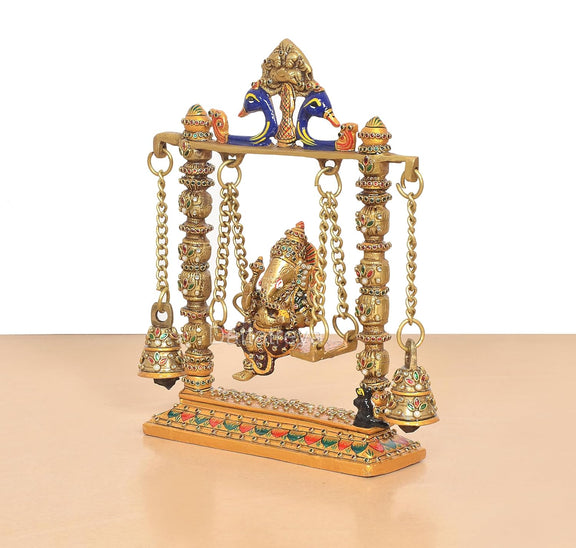 Celebrate devotion with this charming 8-inch brass Ganesha on a swing, featuring two parrots holding the chain. This beautifully crafted piece brings a sense of joy and serenity to your space, making it a perfect gift or a loving addition to your home altar. Its intricate design symbolizes harmony and blessings, inviting positive energy and warmth wherever it is placed.
