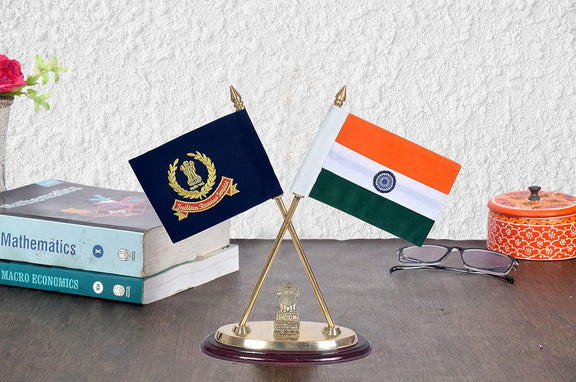 This desk flag set includes two crossed flags mounted on an oval, dark wood-toned base with a metallic gold finish. The flags are held by two slender, gold poles that cross each other. At the base where the poles meet, there is a small, detailed emblem of the Lion Capital of Ashoka in a matching gold tone. One flag is the Indian National Flag. It displays the horizontal tricolor of saffron on top, white in the middle with the Ashoka Chakra in navy blue at its center, and green at the bottom. The other flag is dark blue with gold embroidery. It features the Lion Capital of Ashoka at the top center, above the words "Indian Revenue Service" written in stylized script. Below the text, there is a decorative, curved laurel wreath design, also in gold thread..