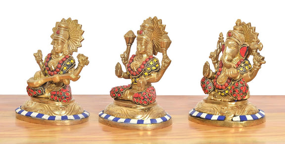 Brass Lakshmi Ganesh Saraswati Idol (Height: 5 Inches) (Multicolor)