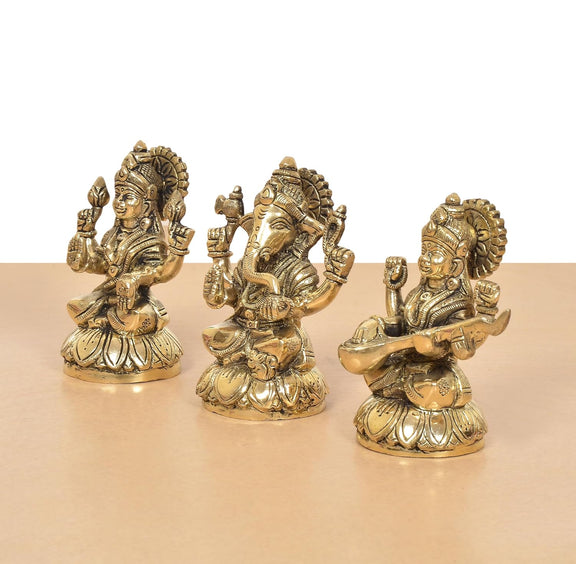 Brass Lakshmi Ganesha Saraswati Idol (Height 4.5 Inch)