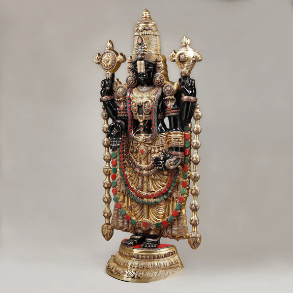 Elevate your spiritual space with this magnificent Tirupati Balaji idol, a stunning representation of Lord Venkateshvara crafted in premium brass. Standing at an impressive 46 inches, this large-scale masterpiece commands attention with its elegant black finish and intricate stone embellishments that catch the light beautifully. Each detail is meticulously designed to capture the divine essence and grace of the deity. Perfect for temples, prayer rooms, or grand home sanctuaries, this idol serves as a powerful focal point for devotion and meditation. The superior brass construction ensures durability and longevity, making it a treasured heirloom piece for generations. Invite blessings and spiritual abundance into your home with this exquisite work of sacred art.