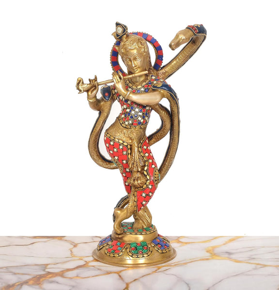Brass Lord Krishna Surrenders to Kaliya naag Sculpture Playing Flute (Height: 15 Inch)