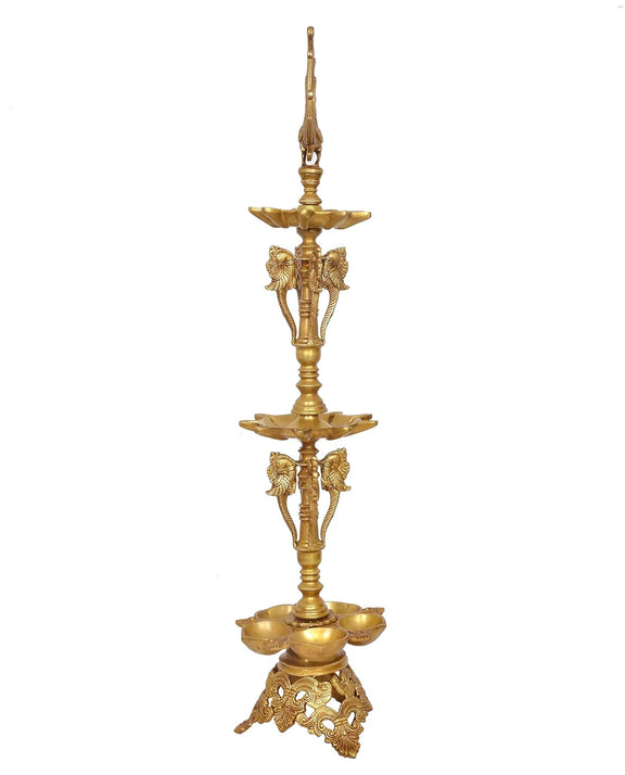 Elevate your spiritual space with this exquisite brass oil lamp stand, a timeless treasure that brings warmth and grace to any home. Standing at an impressive 33 inches, this handcrafted piece features an enchanting peacock design that symbolizes beauty, prosperity, and divine protection in Indian tradition. The lustrous brass construction develops a rich patina over time, adding character and authenticity to your décor. Perfect for daily prayers, festive celebrations, or as a cherished heirloom, this diya stand transforms ordinary moments into sacred rituals. Let its gentle glow illuminate your home while honoring centuries of cultural artistry.