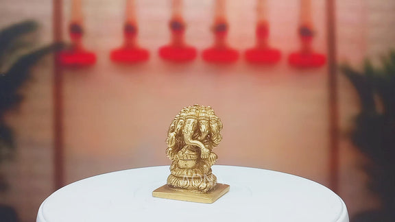 Elevate your sacred space with our exquisite Brass Panchmukhi Ganesha Idol. This divine five-faced representation of Lord Ganesha symbolizes his omnipresence and complete protection. Meticulously crafted from premium brass, this idol radiates spiritual energy while adding a touch of elegance to your home or temple. Invite prosperity, wisdom, and the removal of obstacles into your life with this auspicious masterpiece. Perfect as a meaningful gift or personal devotional item.