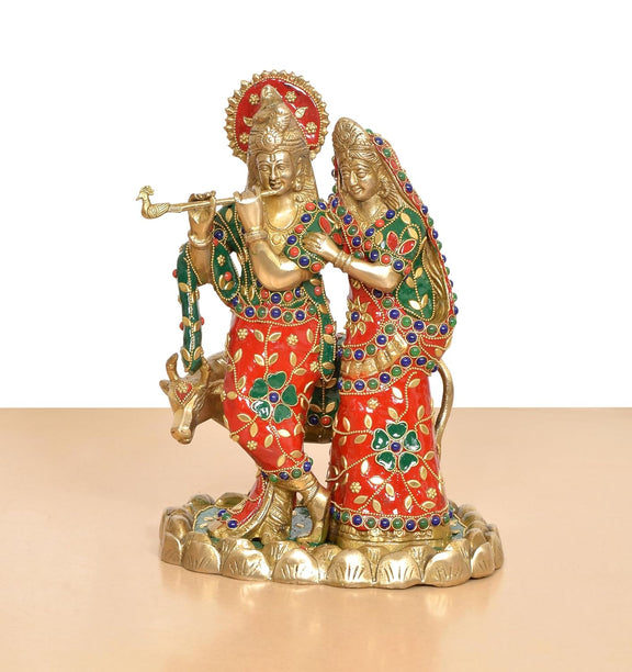 Celebrate divine love and devotion with this exquisite Brass Radha Krishna with Cow Idol, standing 11 inches tall. Crafted with care, it beautifully captures the eternal bond between Radha and Krishna, accompanied by the sacred cow symbolizing purity and abundance. This charming piece brings a serene and loving presence to your home, perfect for prayer spaces or as a thoughtful gift to inspire spiritual connection and harmony.