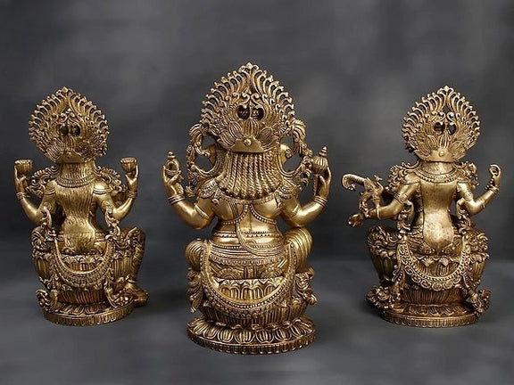 Brass Set of Lakshmi, Ganesha and Saraswati Idol (Height: 26 Inches)