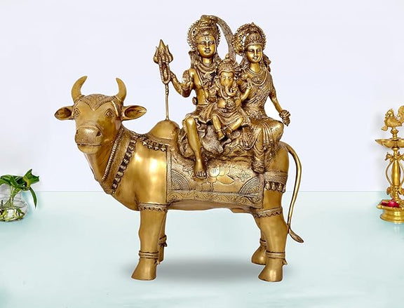 - Brass figurine depicting the Shiv Parivar seated on Nandi, a sacred symbol in Hindu mythology.