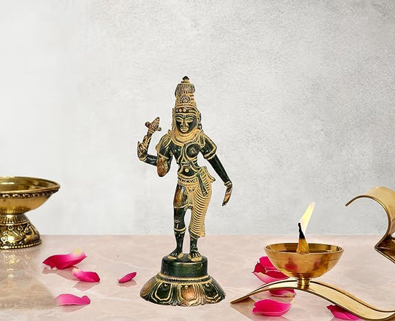 This beautiful brass statue idol of Shiva and Parvati, also known as Ardhanarishvara, stands at 6 inches tall. Crafted with exquisite detail, this piece is perfect for adding a touch of elegance and spirituality to any space. Bring the divine energy of these deities into your home with this premium product.