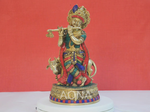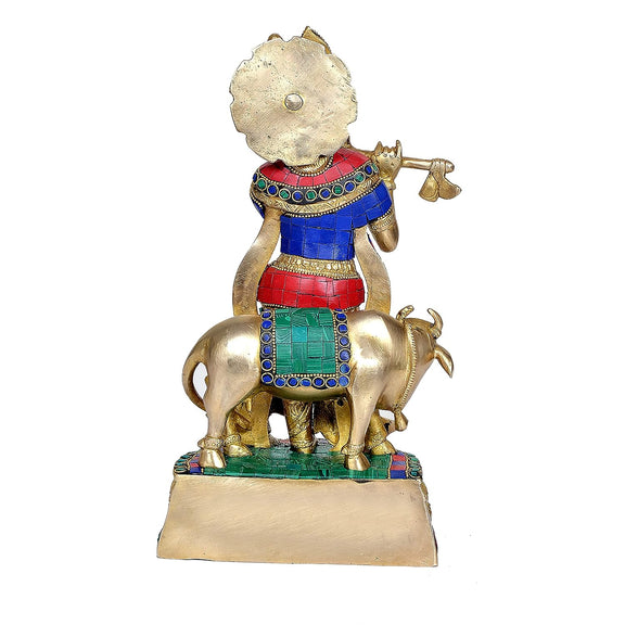 Brass Krishna with Cow Idol (Height 12.5 inches)