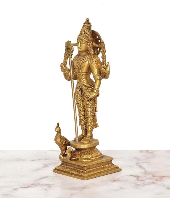 Brass Standing Lord Kartikeya with Peacock Murugan Murti (Height 8 Inch)