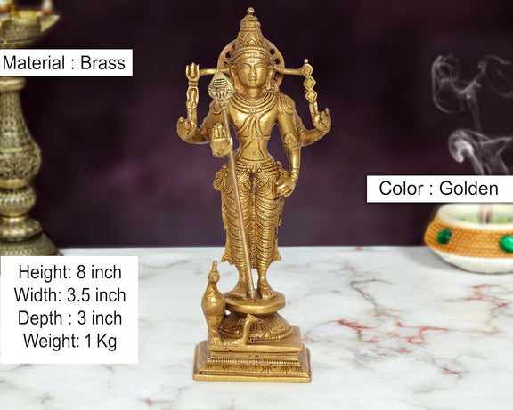 This exquisite 8-inch brass statue of Lord Kartikeya, adorned with his sacred peacock, beautifully captures the divine grace and strength of Murugan. Crafted to inspire devotion, it serves as a meaningful addition to your home or altar, inviting blessings of courage and wisdom. Its detailed design offers a timeless tribute to tradition and spirituality, perfect for those who cherish heartfelt connection in their sacred space.