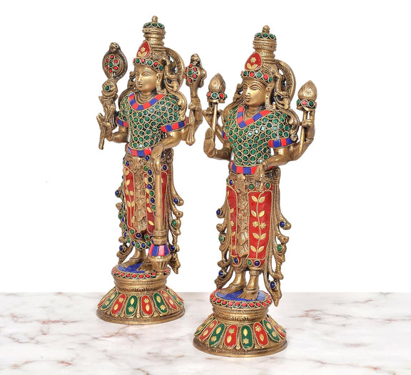Celebrate divine grace with this 13-inch Brass Standing Vishnu Lakshmi Murti. Crafted with care, it beautifully captures the serene presence of Lord Vishnu and Goddess Lakshmi, symbolizing protection and prosperity. Perfect for your home altar or as a thoughtful gift, this murti invites blessings and harmony into your space with its loving craftsmanship.