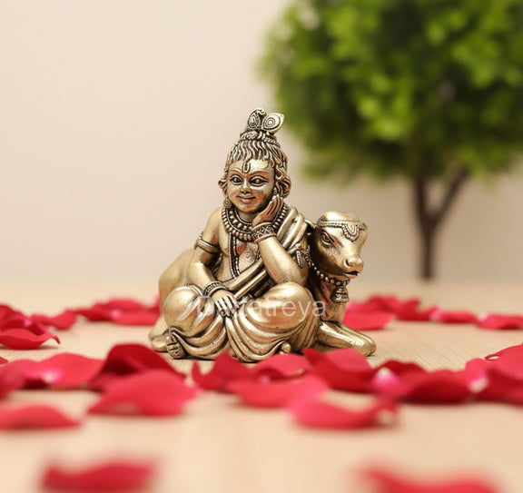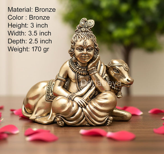 Bronze Lord Bal Gopal with Cow Idol (Height: 3 Inch)