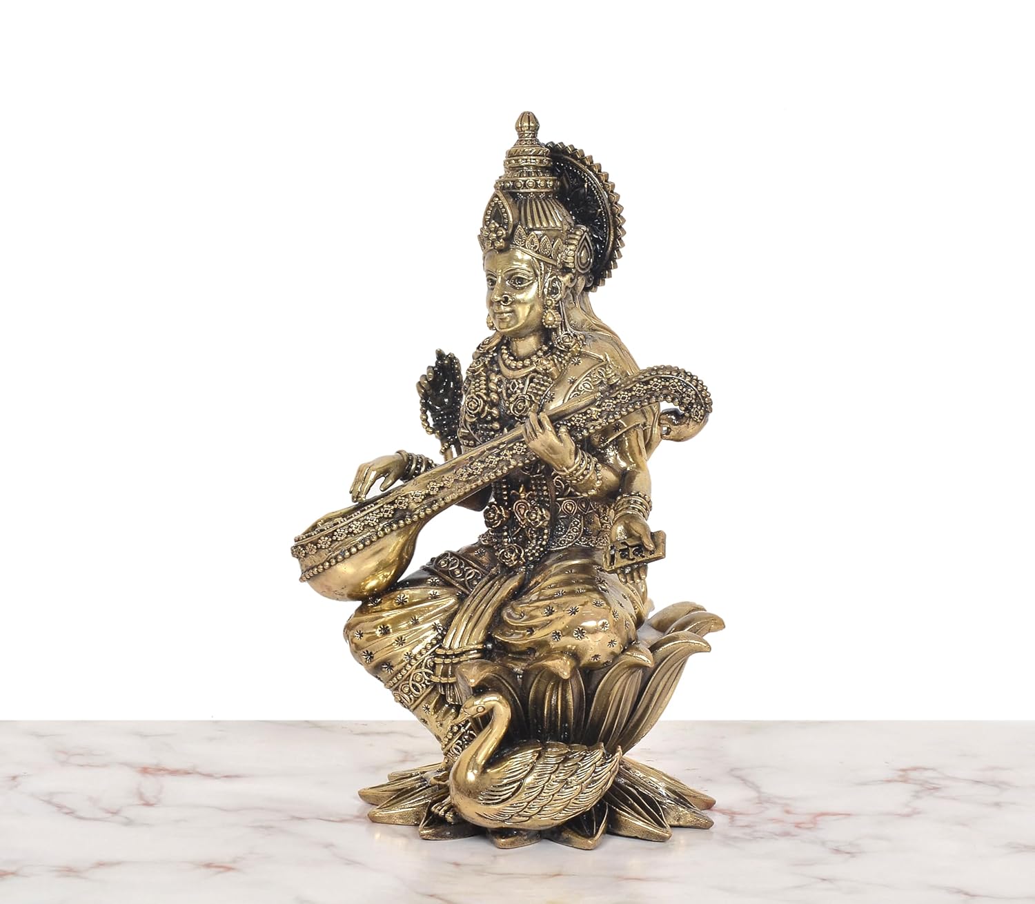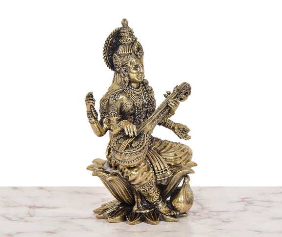 Bronze Maa Saraswati Idol Sitting on Lotus (Height:10 Inch)