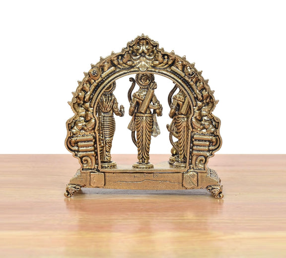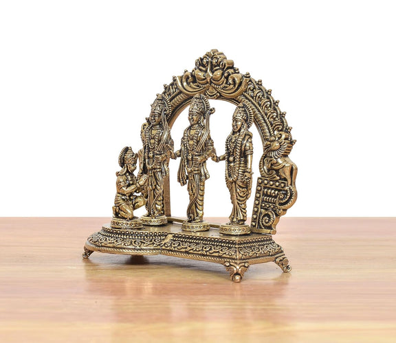 Embrace the divine grace of this exquisite Bronze Ram Darbar, a cherished representation of Lord Rama with Sita, Lakshman, and Hanuman. Crafted with meticulous artistry, this 3-inch bronze masterpiece features an intricately carved frame adorned with the sacred Kirtimukha motif, symbolizing protection and auspiciousness. The warm bronze finish radiates timeless elegance, making it a meaningful addition to your home altar or sacred space. Perfect for daily prayers and spiritual contemplation, this devotional piece honors the eternal bond of devotion and righteousness, bringing blessings and divine presence into your life.