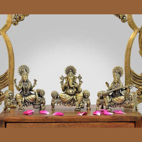 Fine Brass Ganesha laxmi Saraswati Idol on Singhasan (Height 4 Inch)