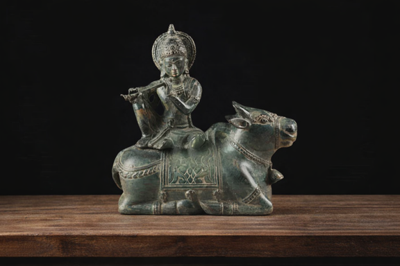 Indonesian Bronze Lord Krishna Sitting on Cow Idol (Height: 9 inch)