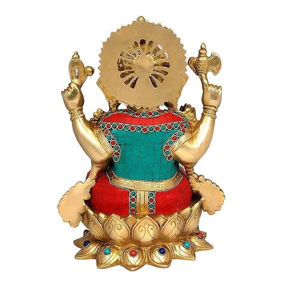 Brass Ganesha Sitting On Lotus Pedestal Statue (Height 13.1 Inch)
