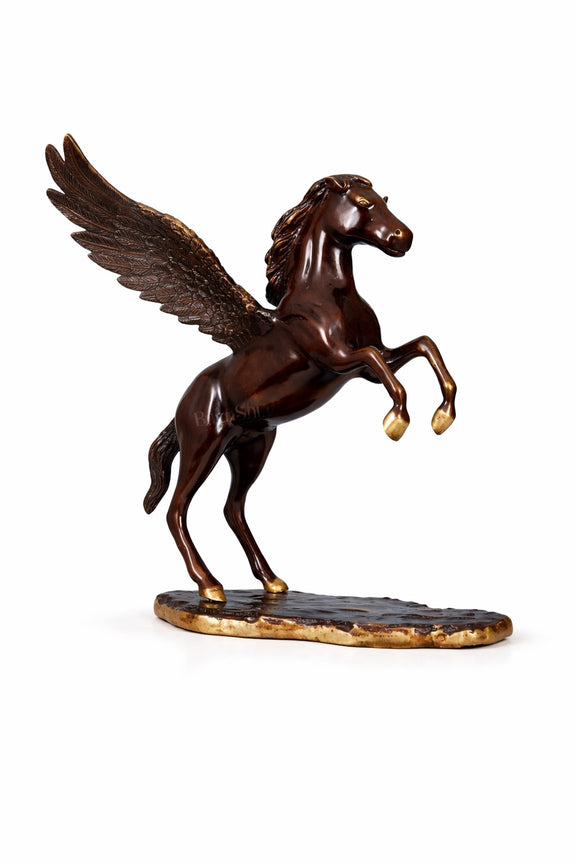Majestic brass sculpture capturing the mythical Pegasus in graceful flight. This striking statue stands 16.5 inches tall, commanding attention in any space with its intricate detailing and dynamic pose. Crafted from premium brass, it weighs 8.07 kg and measures 16.9 inches wide by 17.9 inches deep. Perfect for collectors, home décor enthusiasts, or those seeking a statement piece that blends artistry with classical mythology. The warm golden tones of brass develop a beautiful patina over time, adding character and depth. Maintain its lustrous finish by gently wiping with a soft, dry cloth. Keep away from moisture and harsh chemicals to preserve the craftsmanship for years to come.