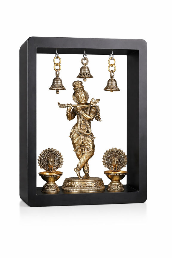 Brass Lord Krishna Idol with Peacock Lamps & Hanging Bells (Height :11 Inches)